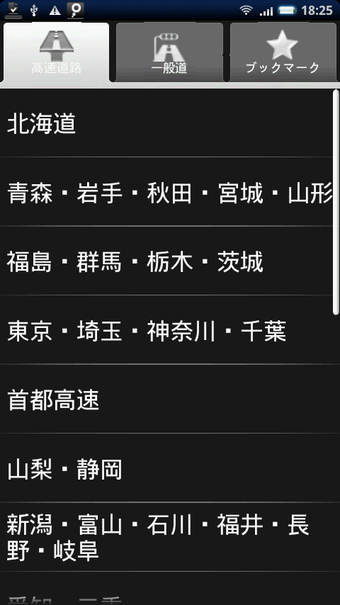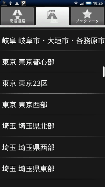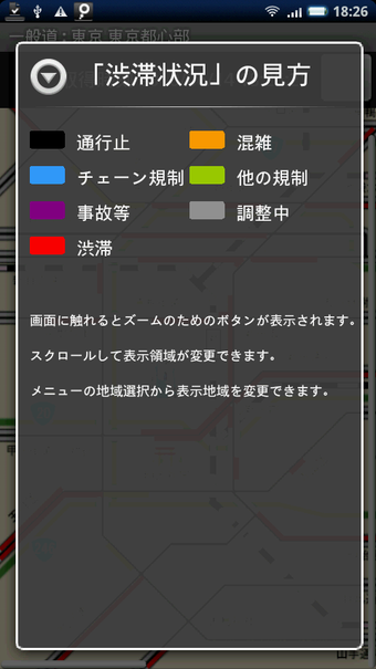 渋滞情報を起動すると、早速「首都高速」の路線図が表示され、渋滞情報が色分けされます。住んでいる場所の周辺の渋滞情報に切り替えるには、メニューから「地域」を選択しましょう。自分の居住地域を選ぶと画面が切り替わり、居住地付近の渋滞情報が表示されます。道路が薄い灰色以外の色で表示されていると、何らかの事情によりその道路は渋滞していることを示しています。軽快に動作するため、表示の切り替えにストレスを感じることはほとんど無いでしょう。JARTICのサイトで5分毎に情報が更新されるのを検出して、画面を自動更新してくれるのも嬉しいところです。